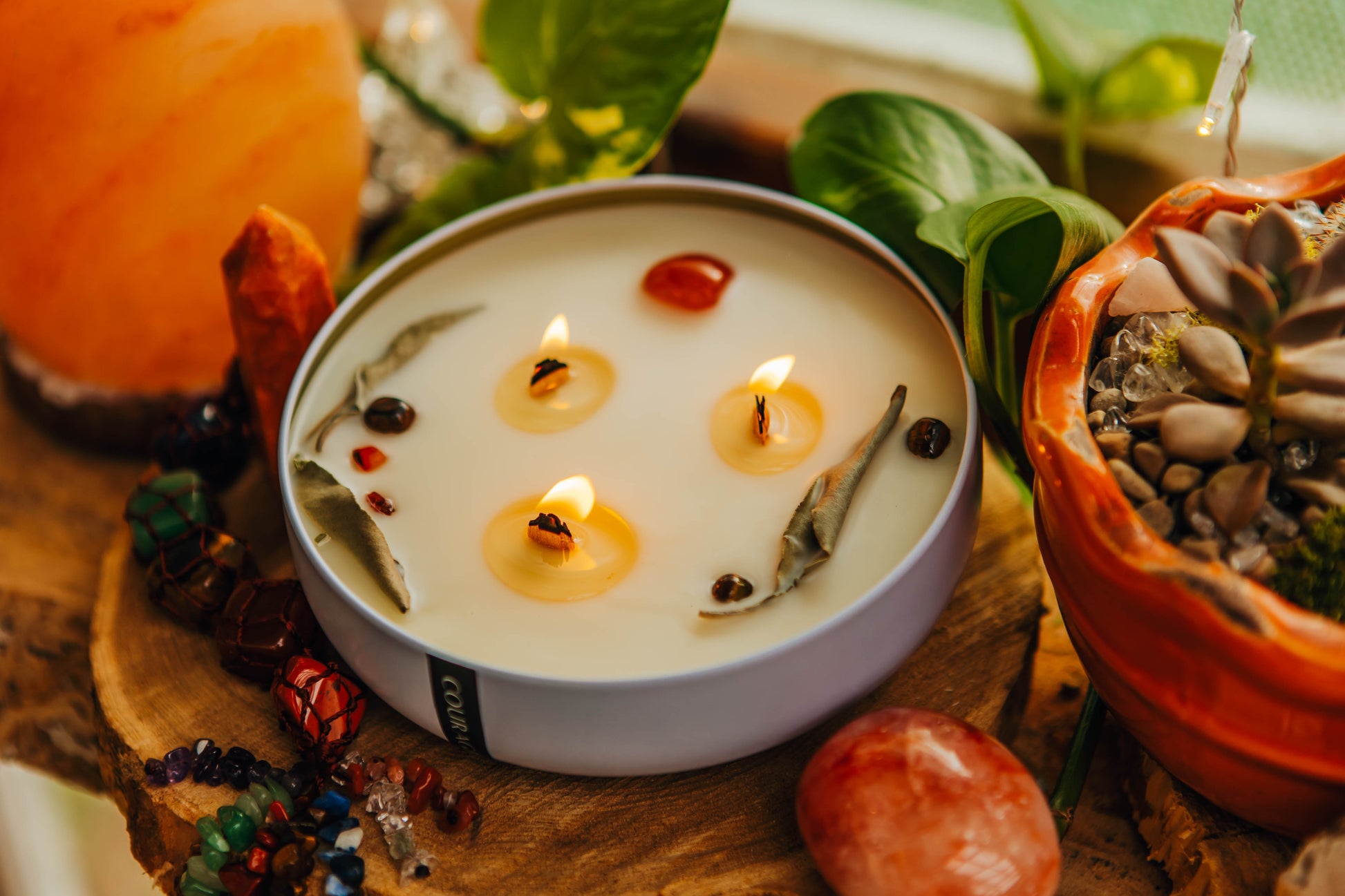 This candle is made with a coconut/soy wax blend and accented with real Orange Carnelian and Golden Tiger's Eye stones as well as dried sage leaves